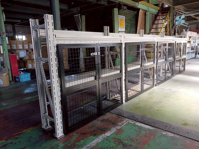 山金工業(株)製、特注の収納ラック。前面両開き扉、側面・背面は金網で囲う仕様になっています。
